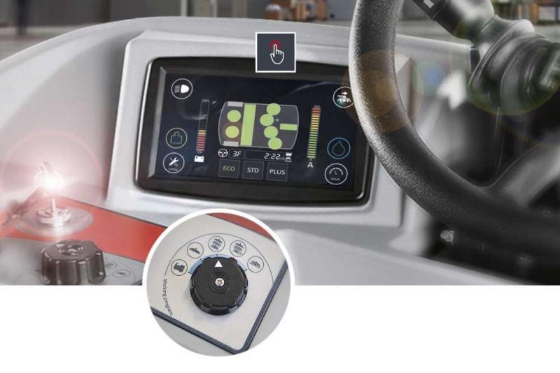 Att använda C130 är så enkelt och intuitivt, med bara en ratt och den nya pekskärmen. Arbetsprogramväljaren gör det möjligt för operatören att välja vilken typ av aktivitet som ska utföras: skura och suga upp, skura och suga upp med den rörligt borsthuvud , bara skura, eller bara suga upp.